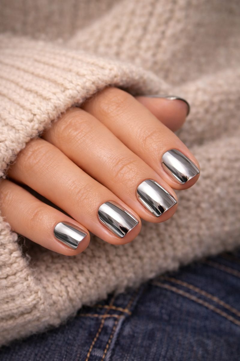 Futuristic and eye-catching, metallic silver nails bring chrome-inspired shine to your January look.
