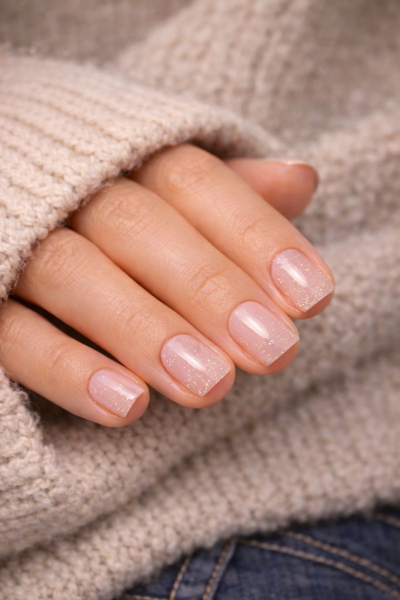 Start with a sheer nude, pale pink, or clear base, then apply a shimmer topcoat containing fine glitter particles.