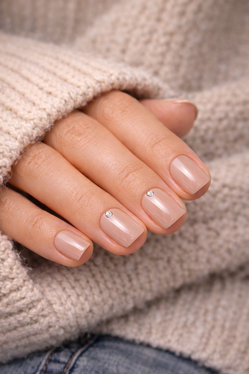 Nude gem nails feature a classic beige or taupe base color enhanced with strategically placed crystal embellishments.