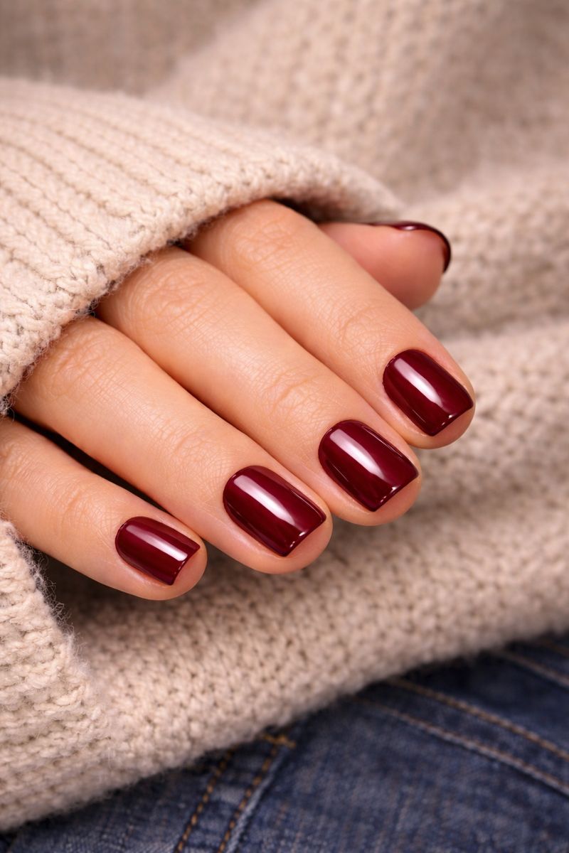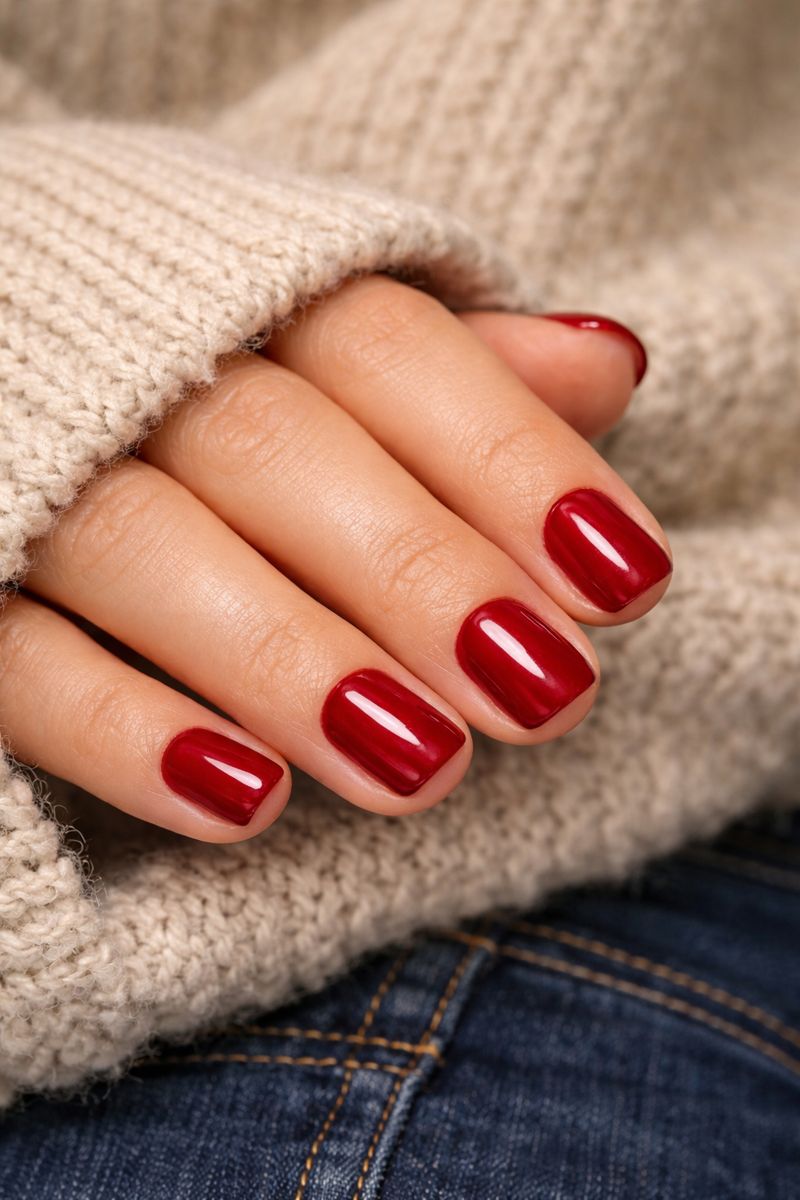 Short nails actually enhance the elegance of this bold color, keeping the look sophisticated rather than overwhelming.
