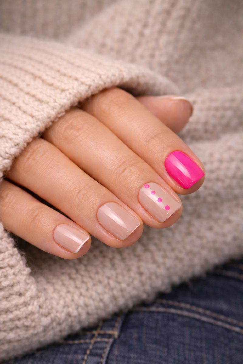 This fun design features a neutral beige or nude base on most nails with bright hot-pink details on one or two accent nails.