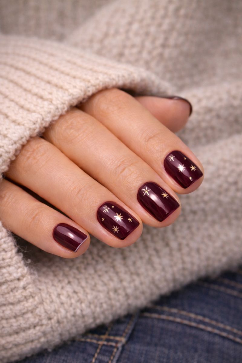 Start with two coats of rich burgundy polish, then use a fine brush or dotting tool to create small starburst shapes using gold, silver, or white polish.