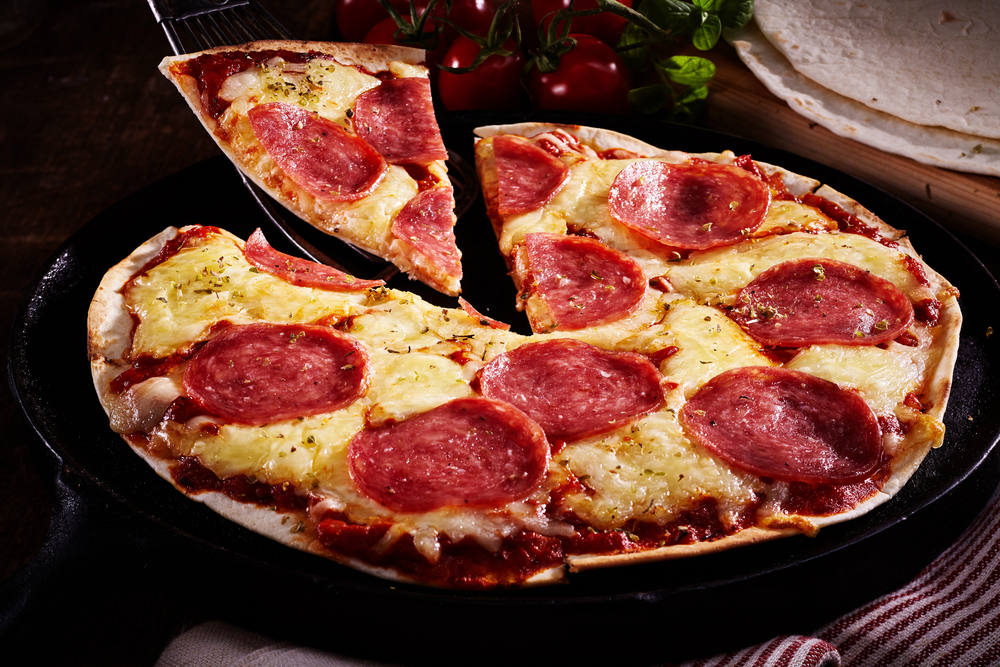 Craving pizza but don’t want to order delivery? Spread marinara or pizza sauce on a tortilla, sprinkle with mozzarella cheese, and add your favorite toppings like pepperoni, mushrooms, or olives. Bake in a hot oven at 400 degrees for about eight to ten minutes until the edges turn crispy and the cheese bubbles.