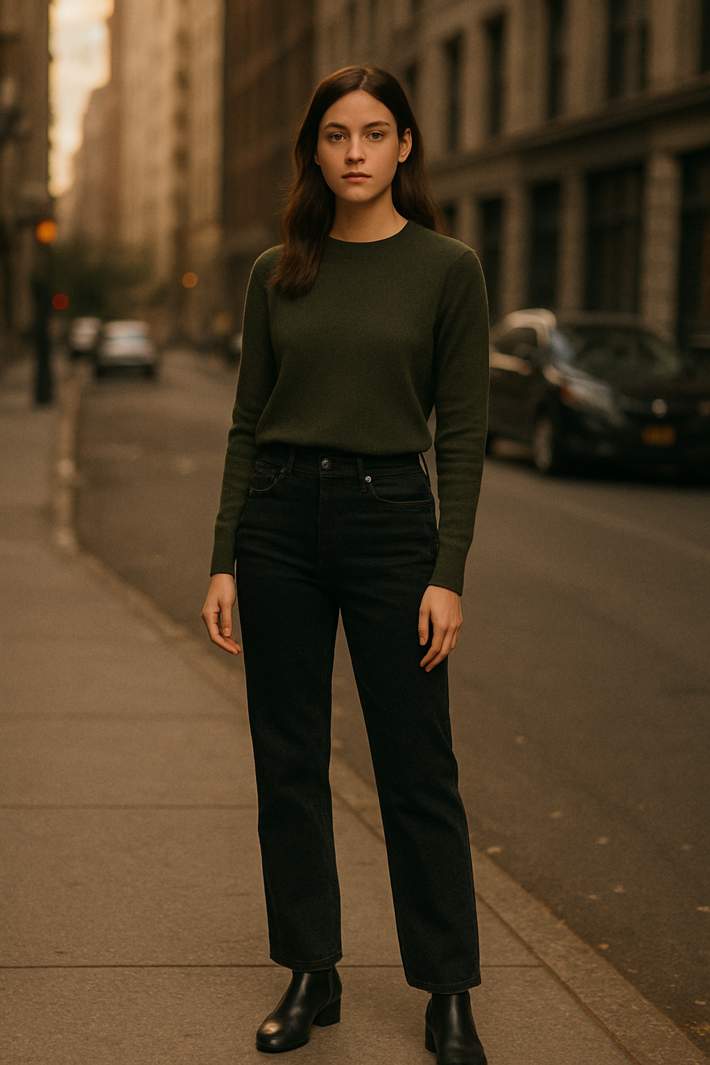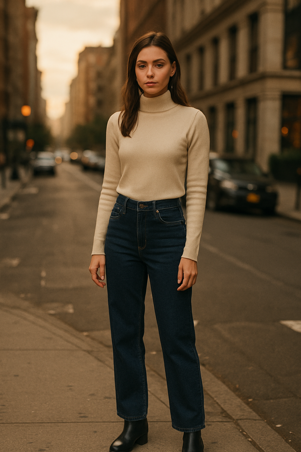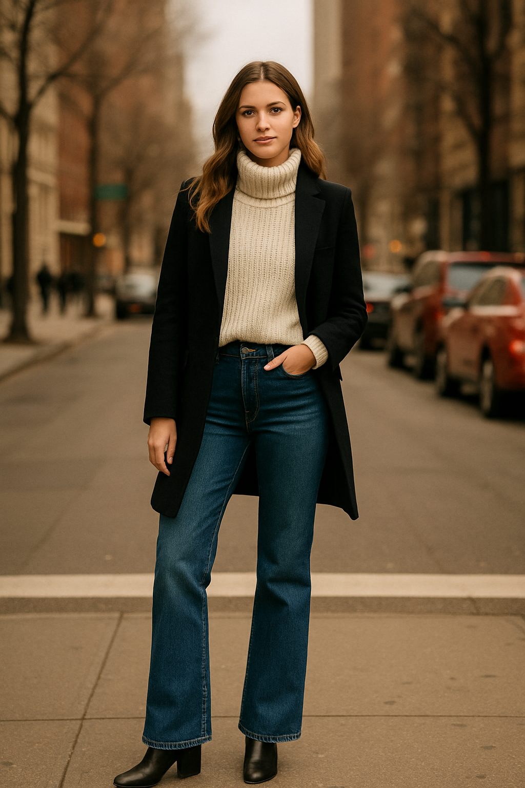 During colder months, dark denim feels seasonally appropriate and pairs beautifully with winter neutrals like charcoal, camel, and cream.