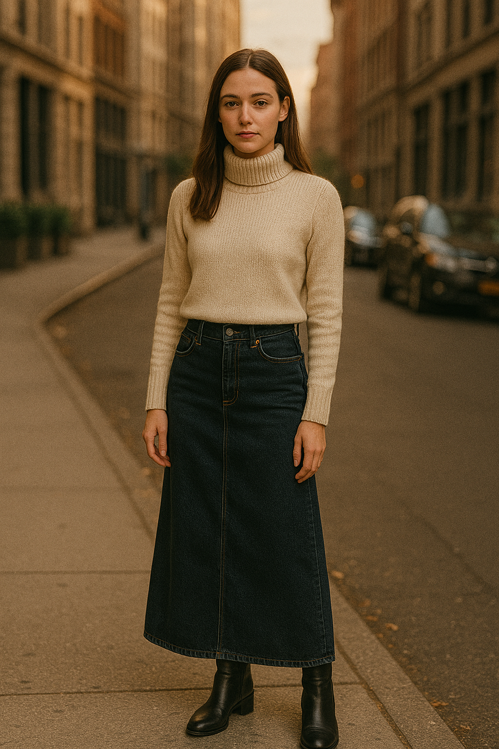 Denim maxi skirts are proving they have serious cold-season staying power when styled thoughtfully with the right layers.