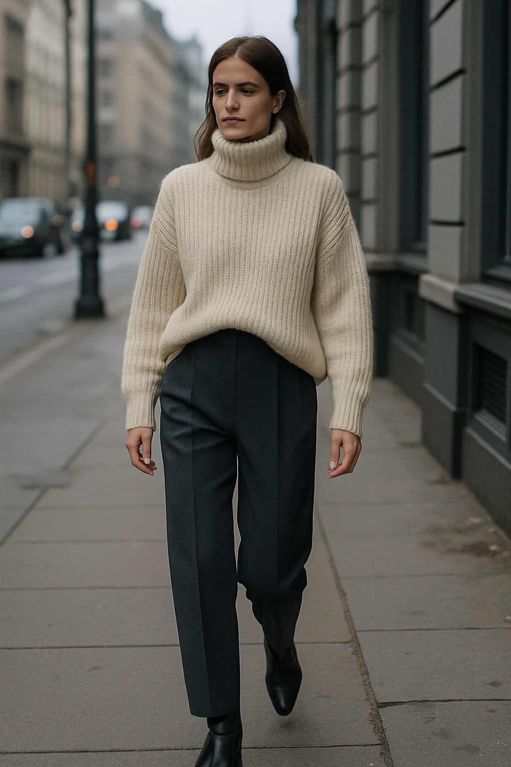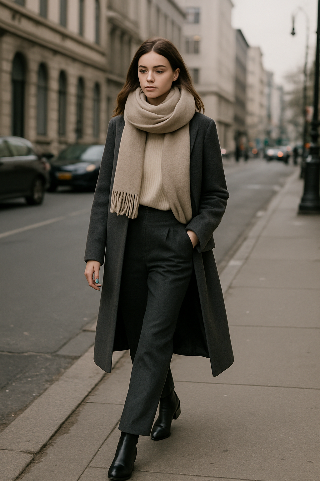 Neutral tones like cream, camel, or charcoal keep the outfit timeless, while sleek ankle boots and delicate gold jewelry add just the right amount of refinement.