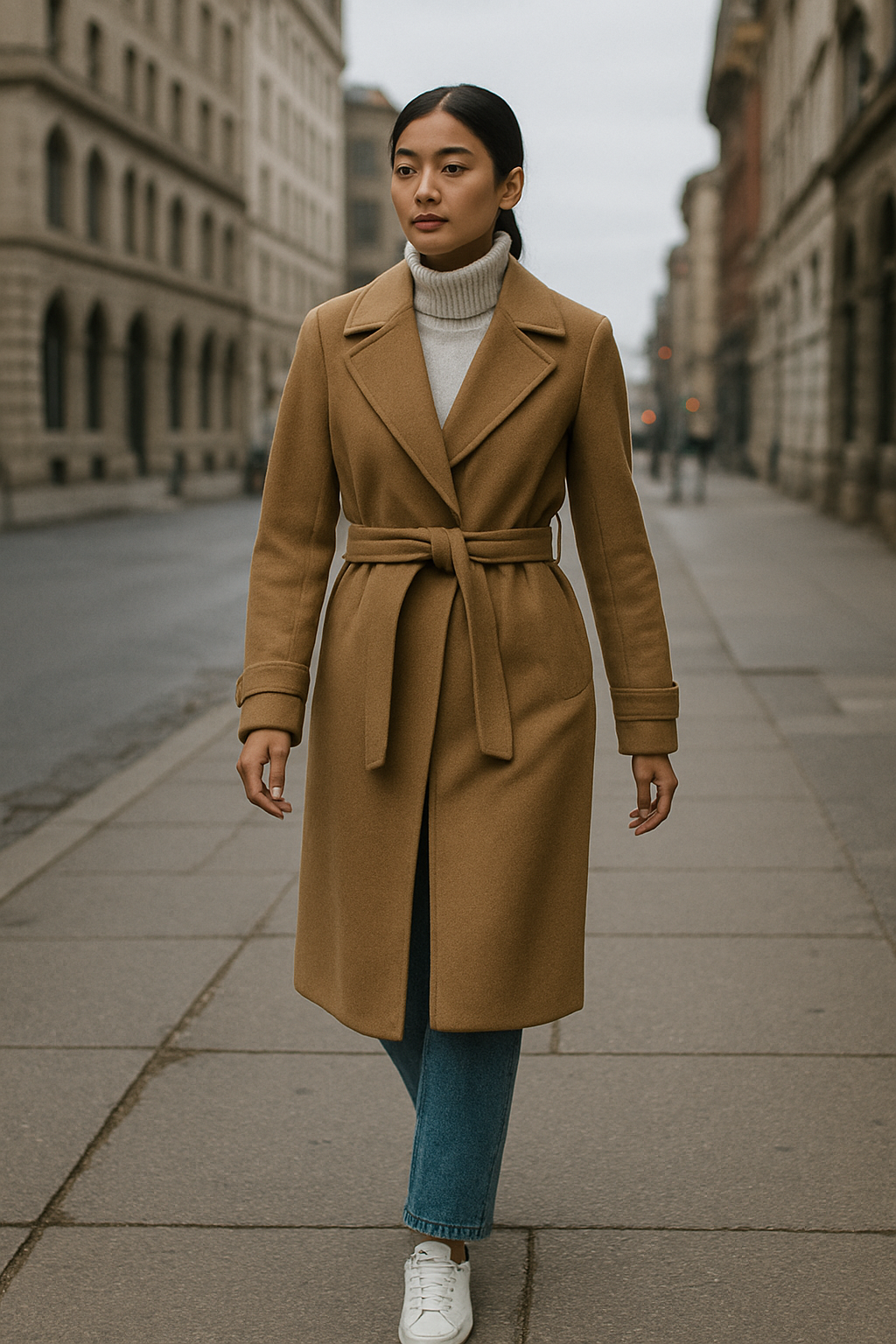 A belted wool trench coat instantly elevates even the most casual outfit, giving it a polished and intentional feel.