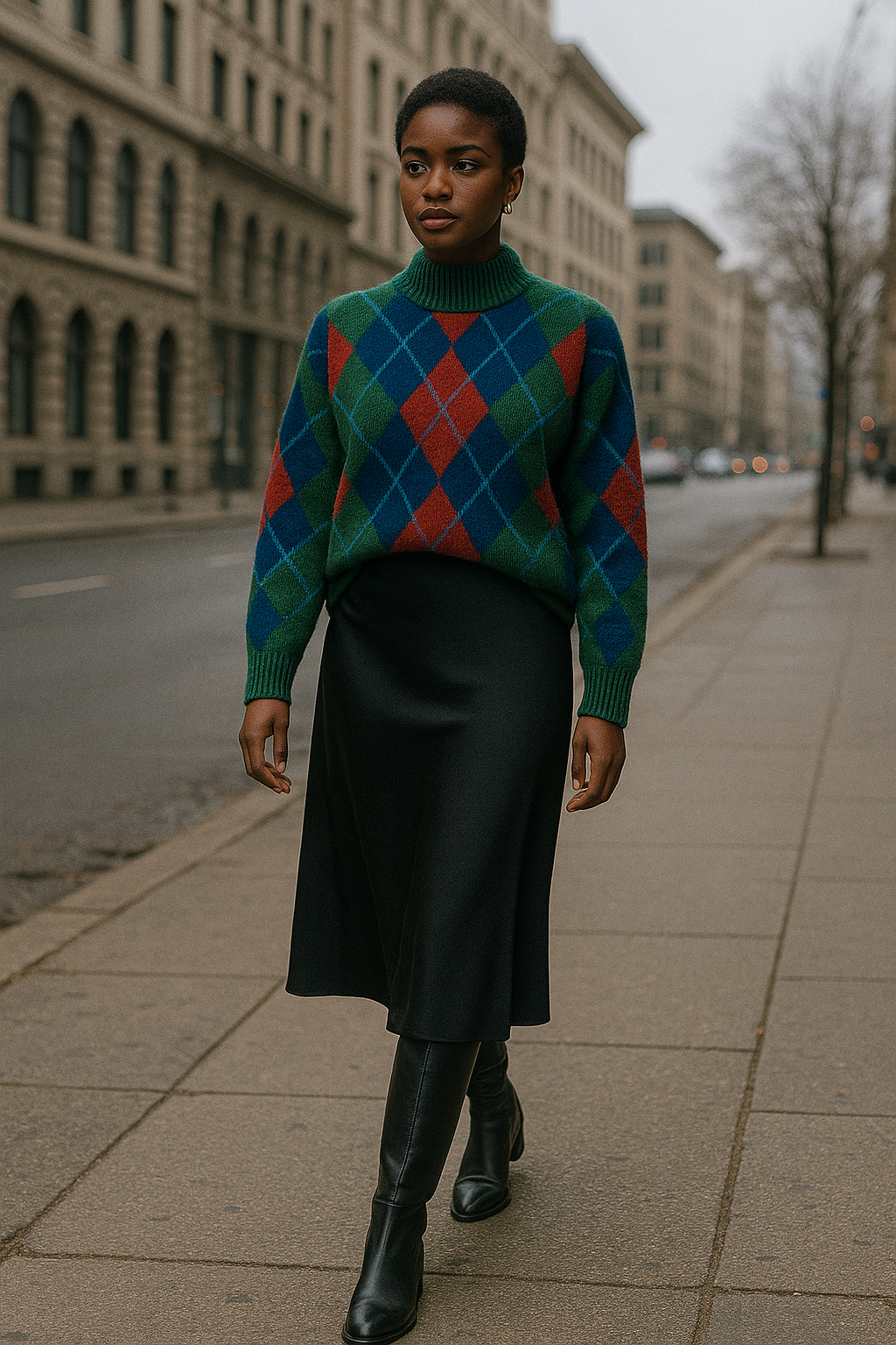 This café-worthy look strikes the ideal balance between quirky and chic, whether you choose a bold argyle color palette or opt for classic neutrals for a more understated winter style.