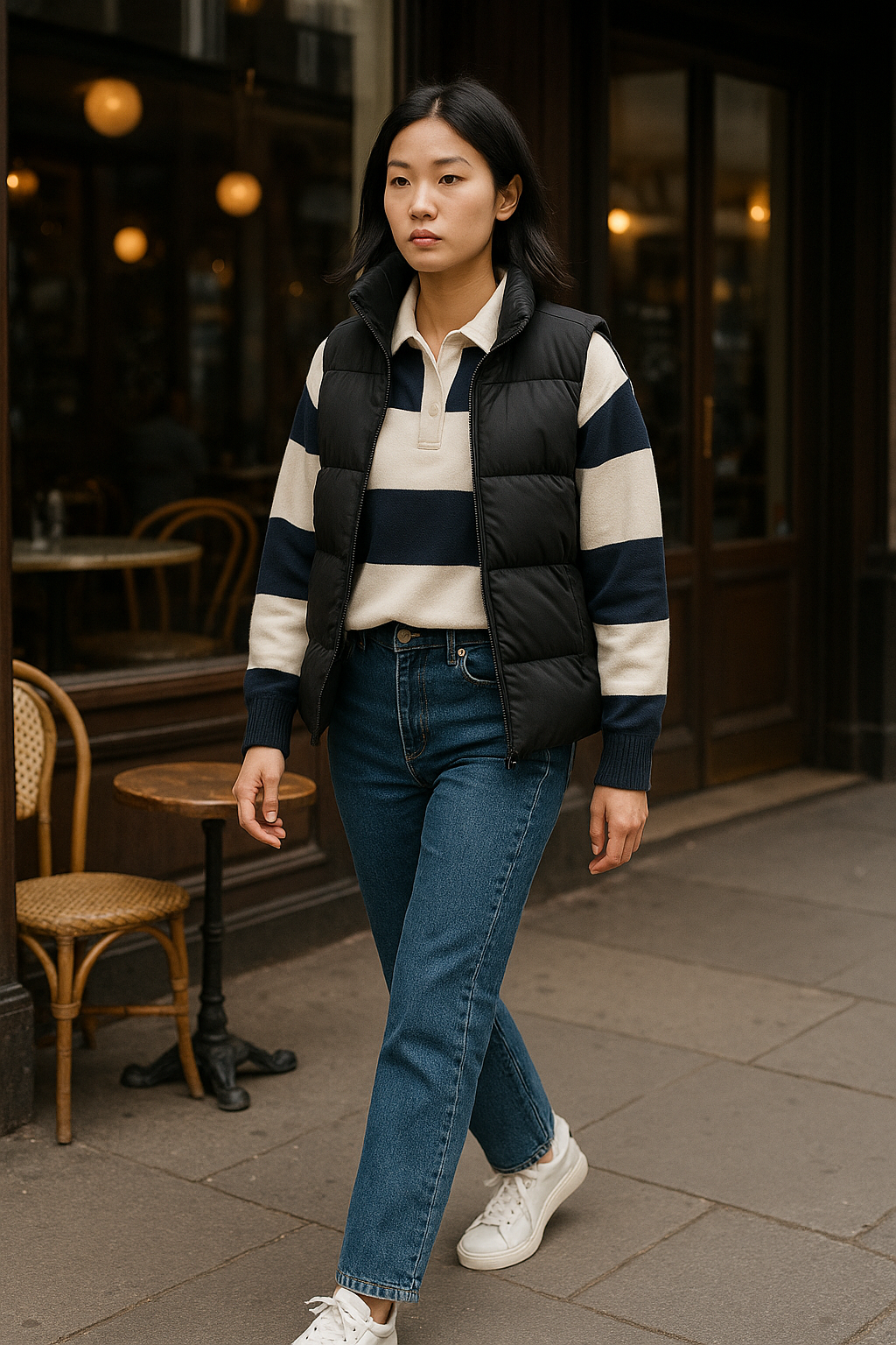 6. Rugby Knit + Puffer Vest + Straight Jeans