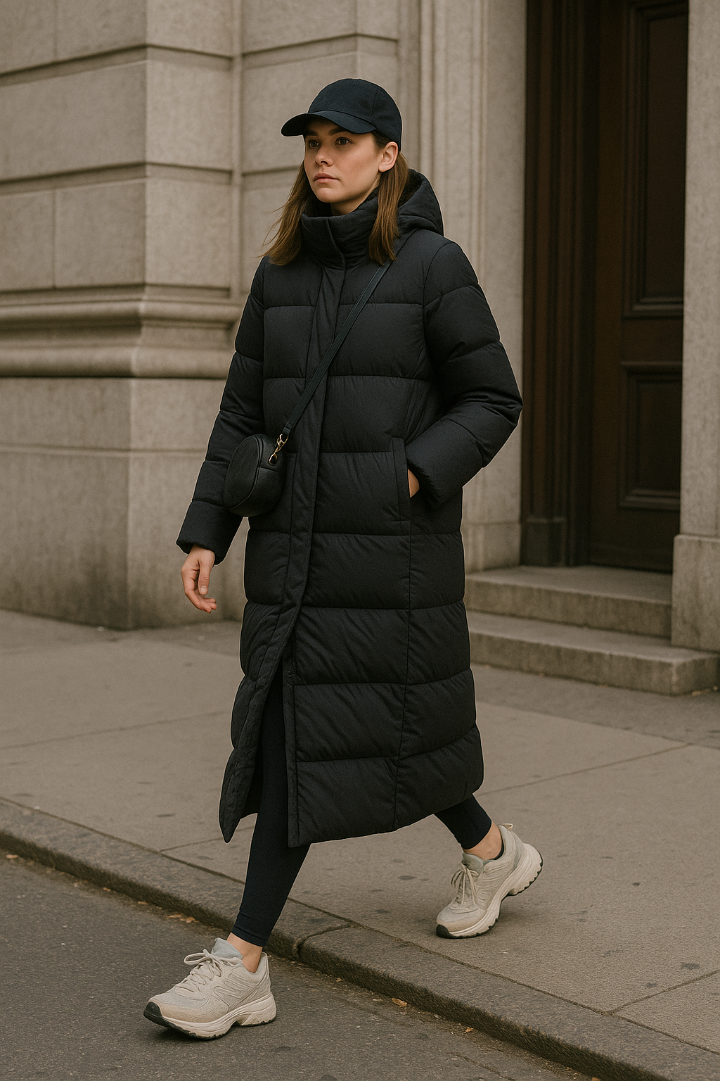Pairing a baseball cap with a longline puffer creates an athletic, laid-back vibe that works perfectly for casual winter brunches, while fleece-lined leggings add warmth without sacrificing polish.