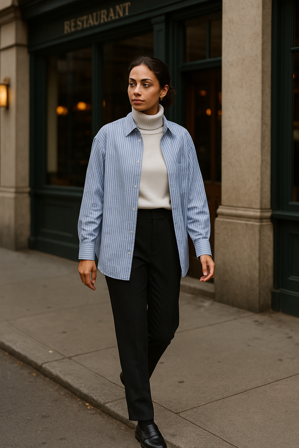 The oxford adds crisp structure while the turtleneck provides essential warmth, and pairing the combination with tailored trousers keeps the overall silhouette polished without feeling overly formal.