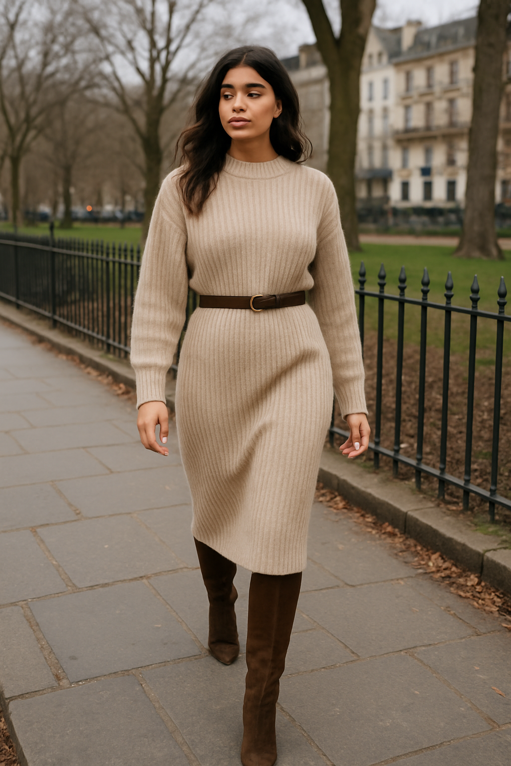 Adding a belt at the waist creates definition and prevents the dress from appearing shapeless, especially when paired with knee-high suede boots that add elegance and help elongate your legs.