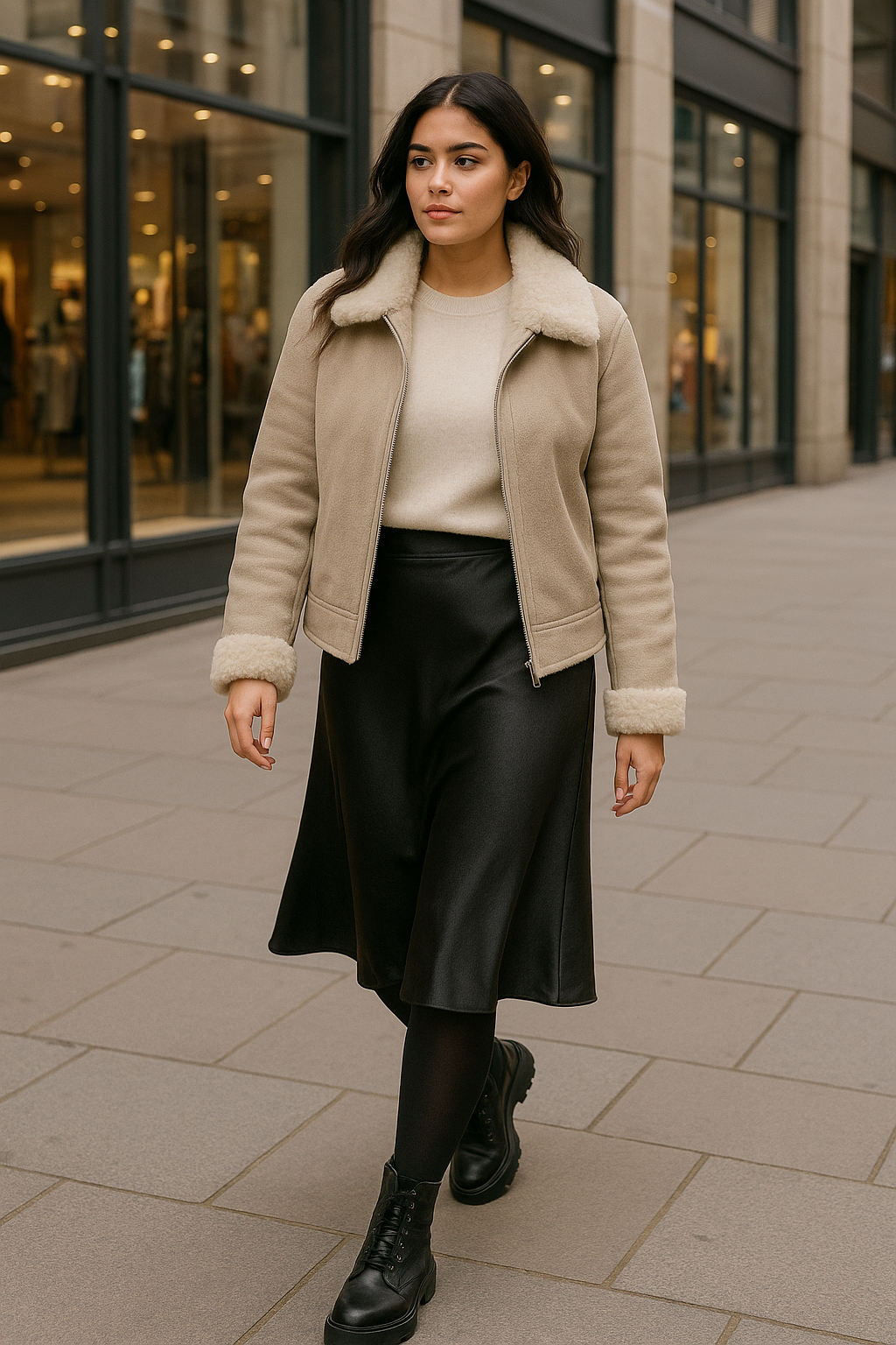 A shearling jacket ties the look together through its plush texture and practical insulation, proving you don’t have to sacrifice femininity for functionality in cold weather.