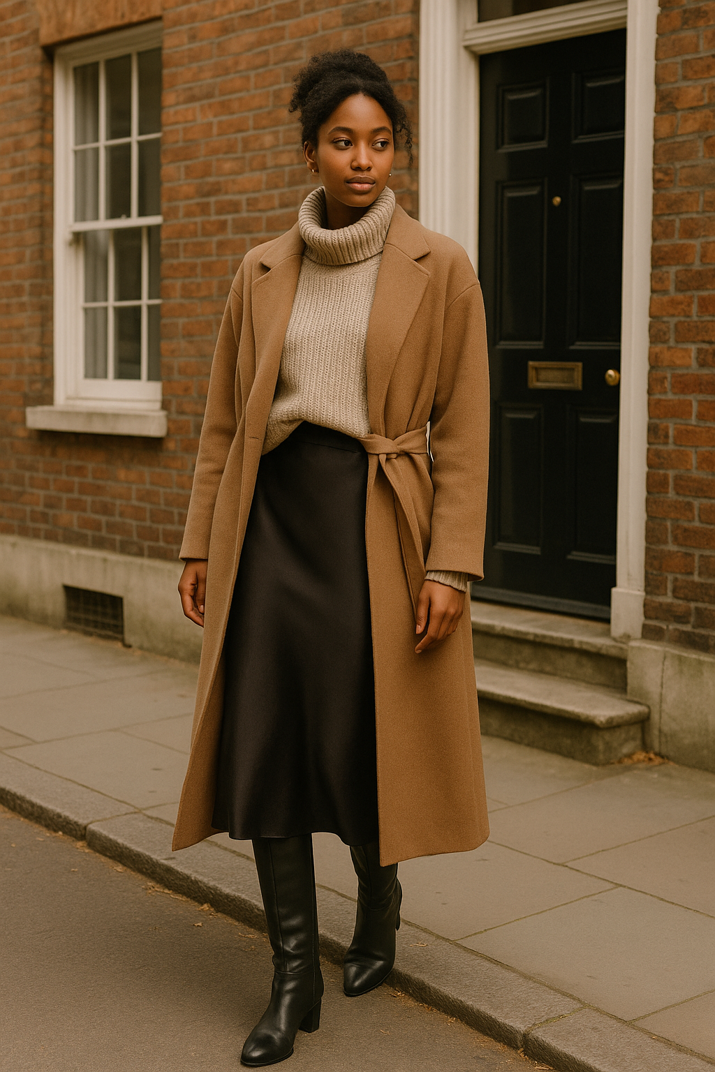 Tall boots provide leg coverage and create a sleek silhouette, and a wrap coat adds sophisticated structure without hiding the thoughtfully layered look beneath.
