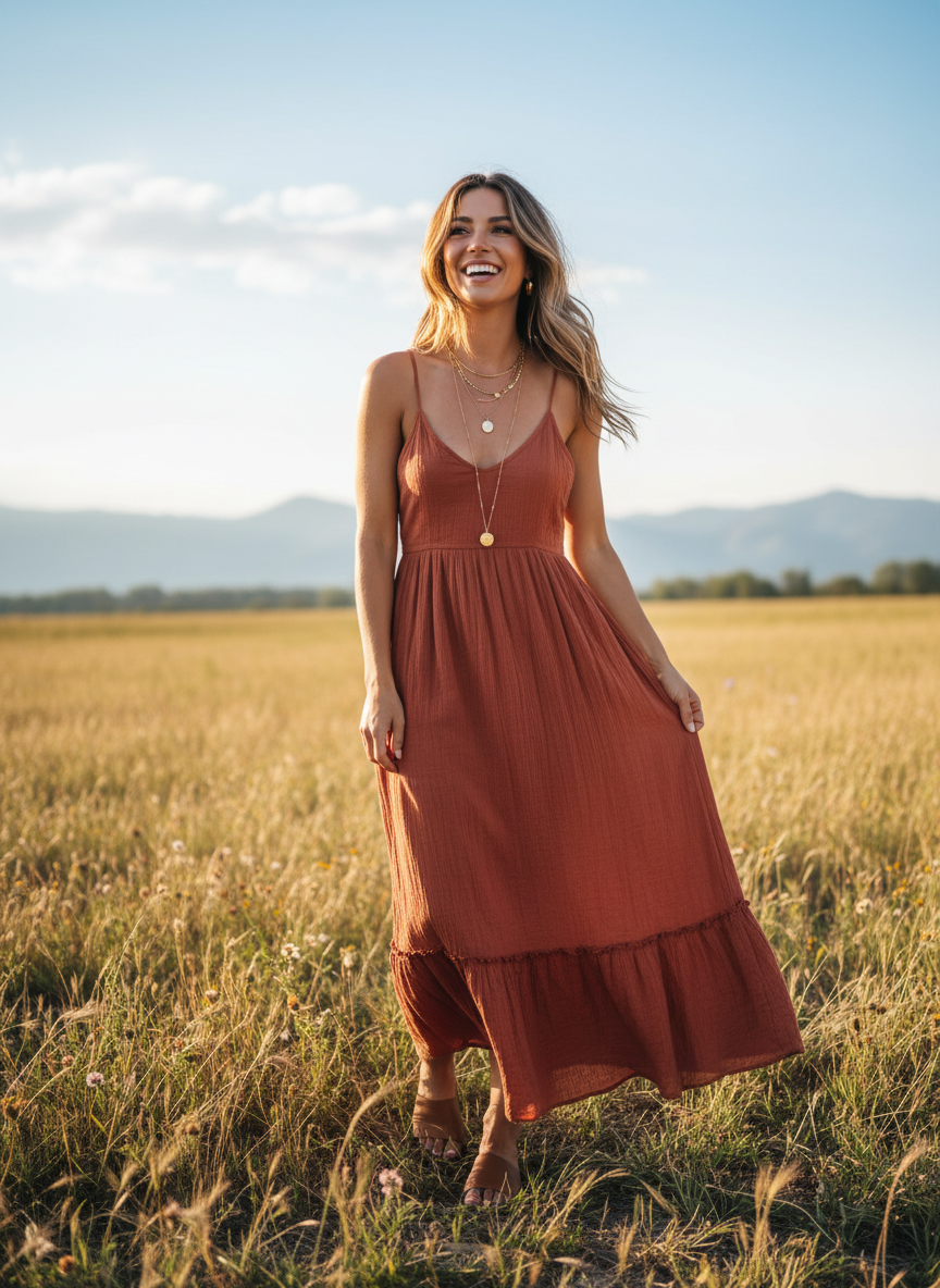 A flowy maxi in a warm, earthy tone or a bold print gives off effortless summer-date energy that’s hard to beat.