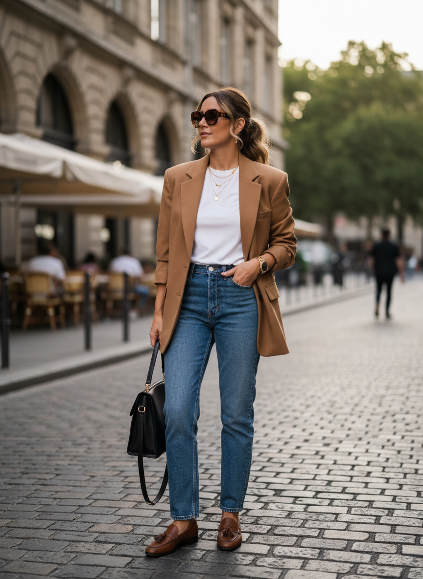 Pairing a structured blazer with straight-leg jeans creates a smart-casual look that works for coffee dates, gallery visits, or casual dinners.