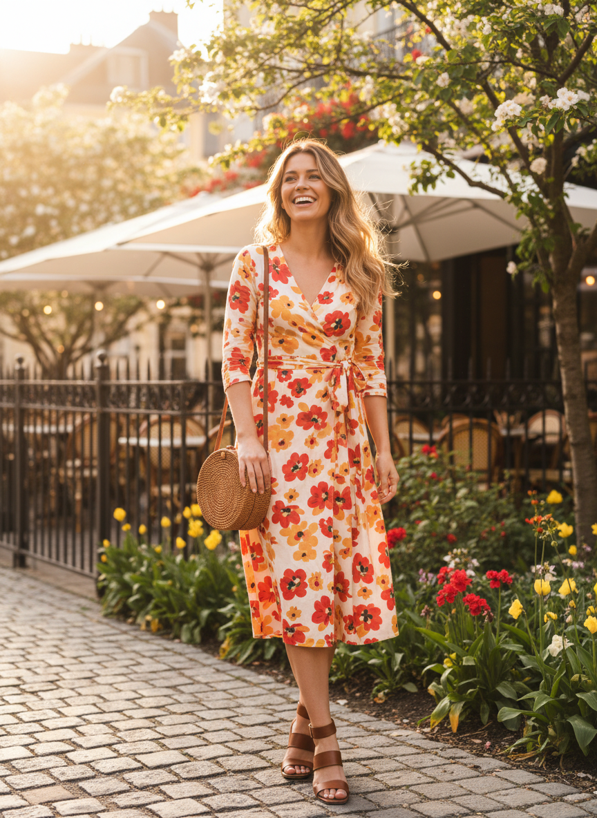 A wrap-style or fit-and-flare floral dress is especially flattering because it naturally cinches the waist and moves beautifully when you walk.
