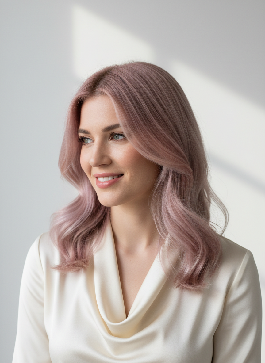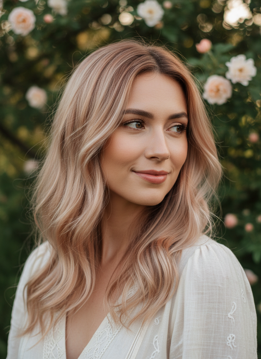 This shade layers soft peach, muted rose, and warm blonde into a color that feels romantic without being over-the-top.