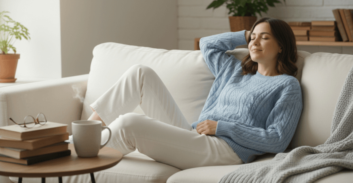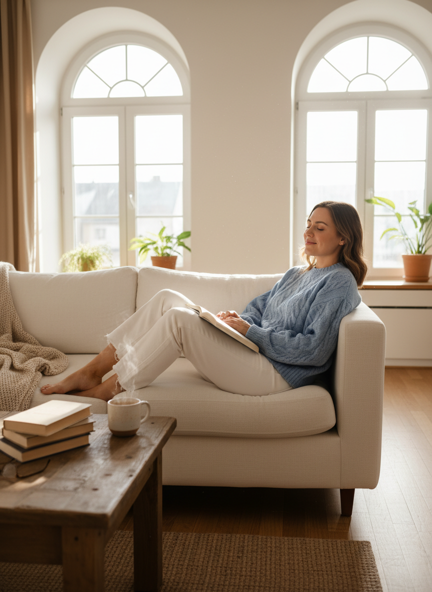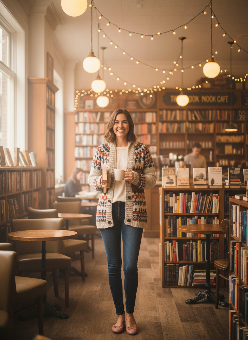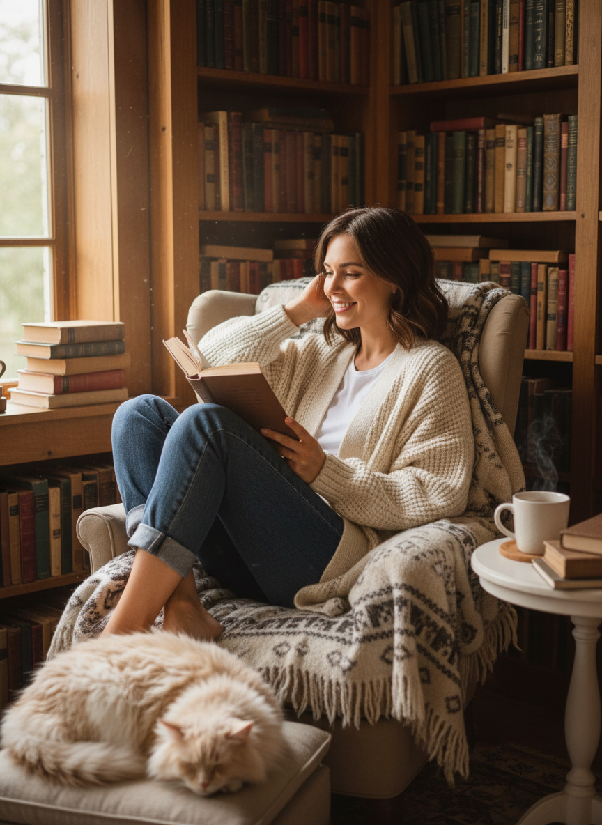 A soft sweater in cashmere or cotton blend provides warmth without weight, perfect for hours of page-turning.