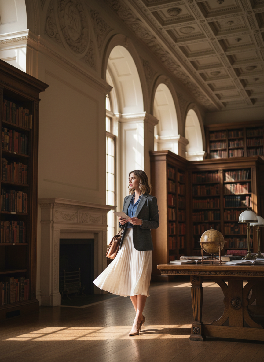 Classic pumps paired with a pencil skirt form the foundation of intellectual elegance.
