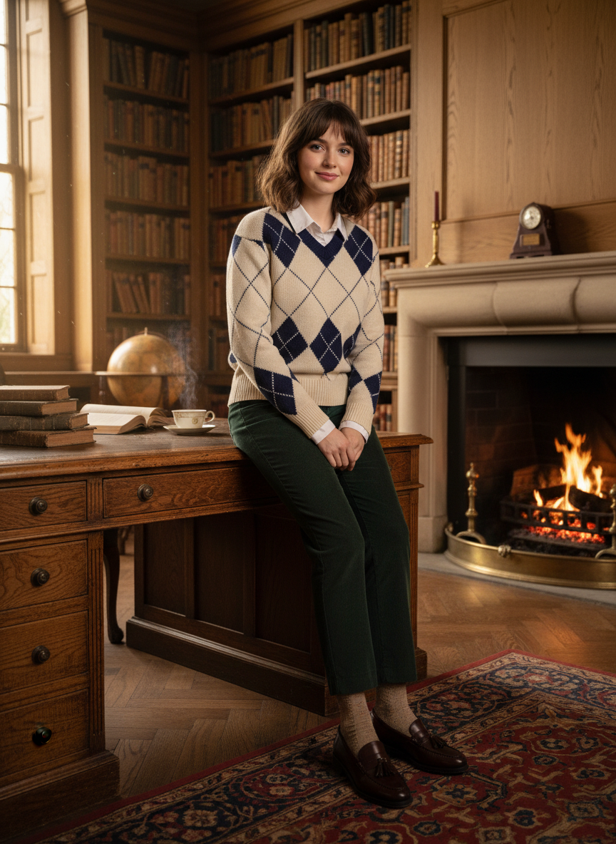 This diamond-patterned sweater layered over a collared shirt creates instant bookish credibility.