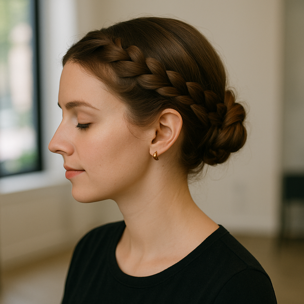 What makes this updo so appealing is its understated beauty—it doesn’t compete with your outfit or accessories but complements them perfectly. A bit of hairspray keeps everything smooth and polished throughout the day.