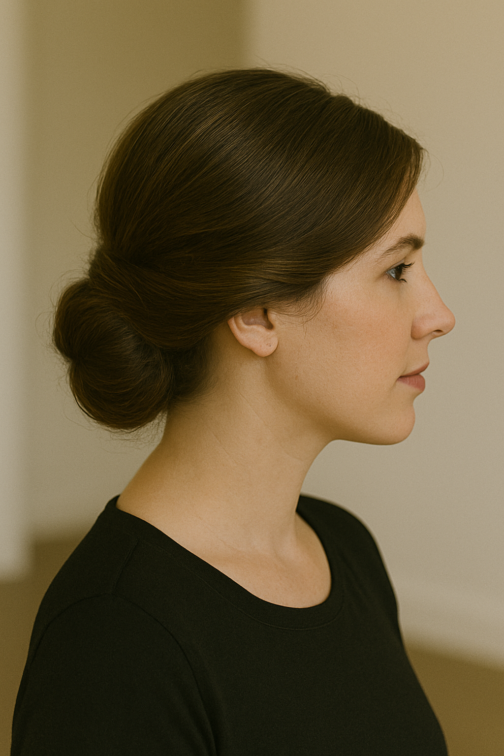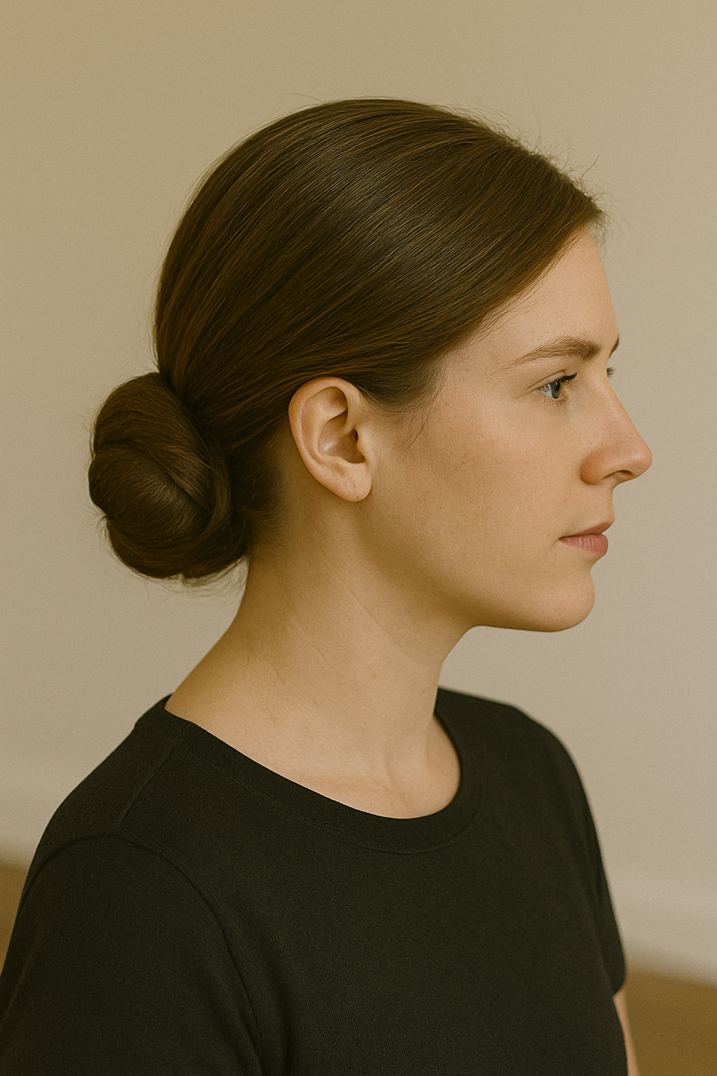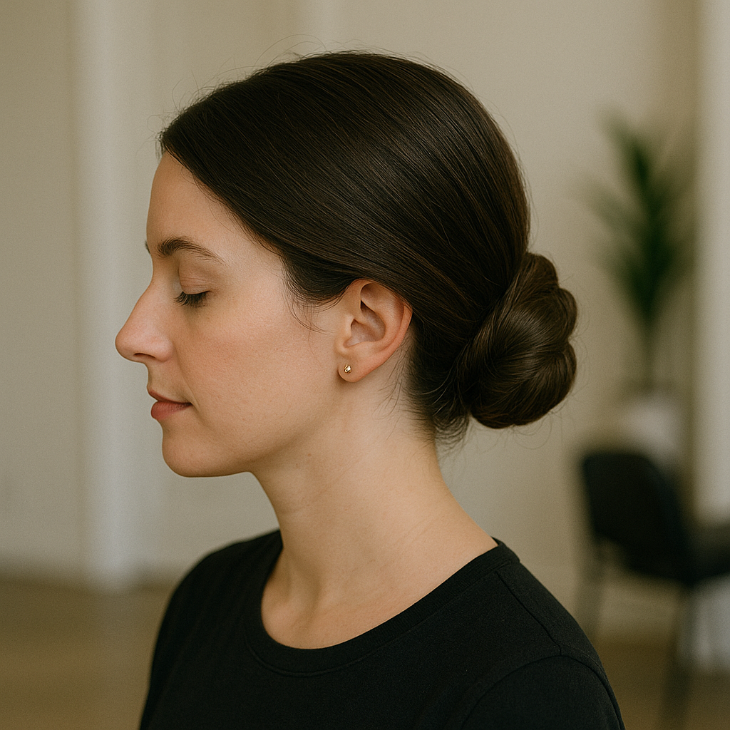 Unlike higher buns that can feel heavy or cause headaches, this low placement sits comfortably at your neck throughout the day. Smooth any bumps with a boar bristle brush and set everything with a flexible-hold hairspray that won’t make your hair crunchy or stiff.