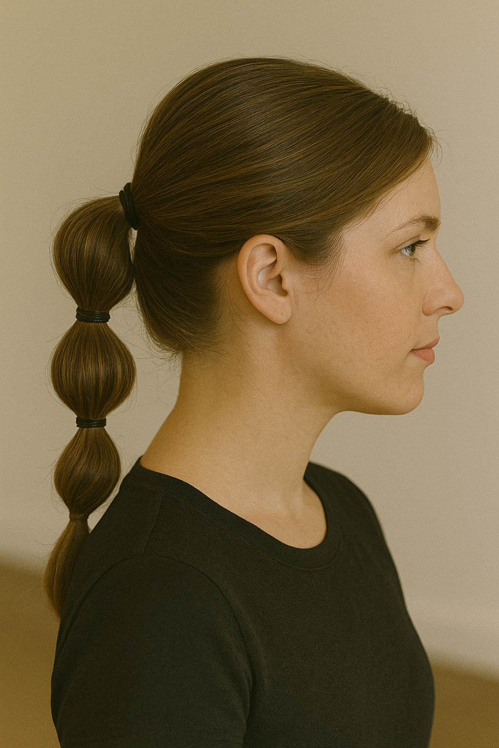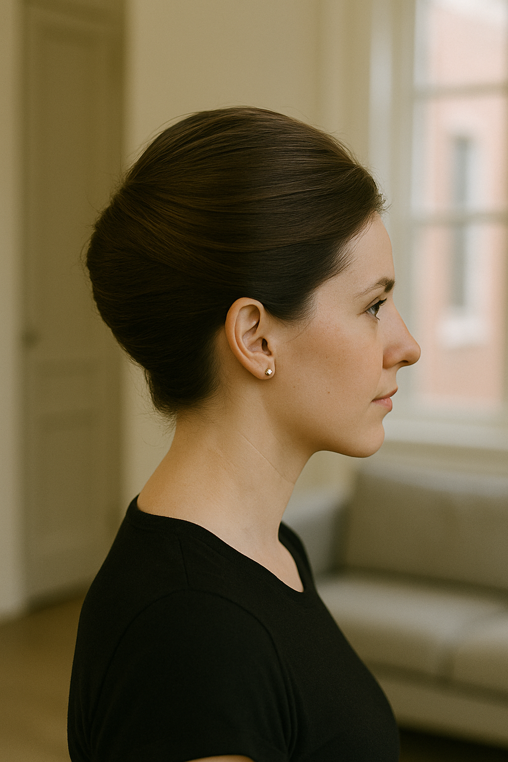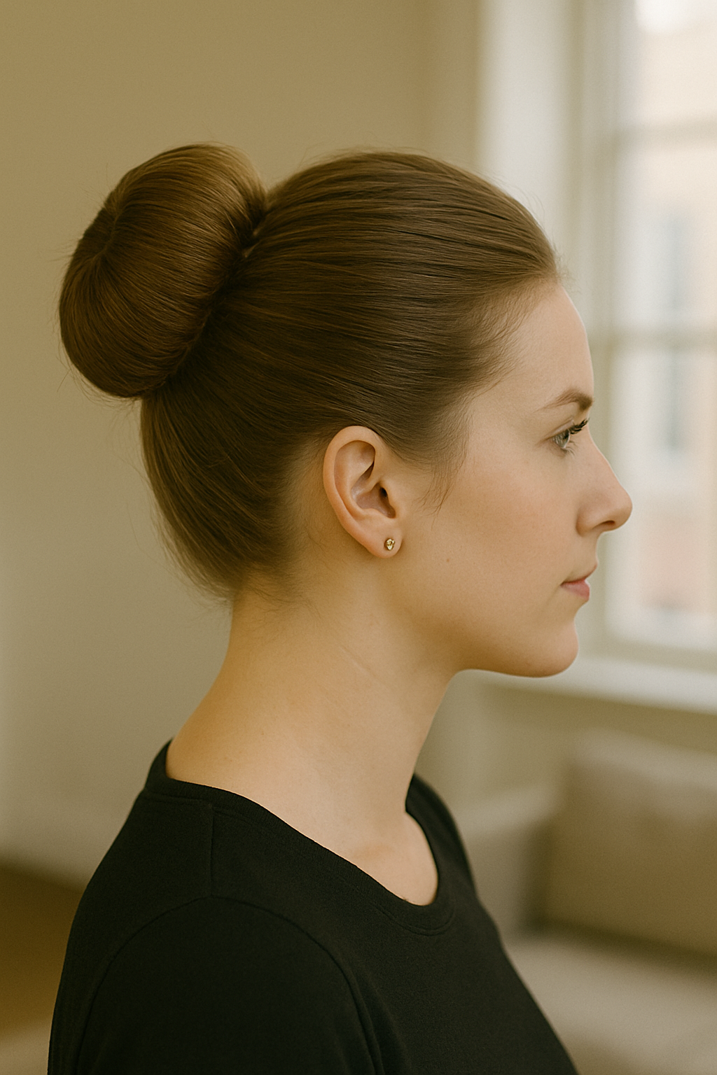 Unlike higher buns that can feel heavy or cause headaches, this low placement sits comfortably at your neck throughout the day. Smooth any bumps with a boar bristle brush and set everything with a flexible-hold hairspray that won’t make your hair crunchy or stiff.