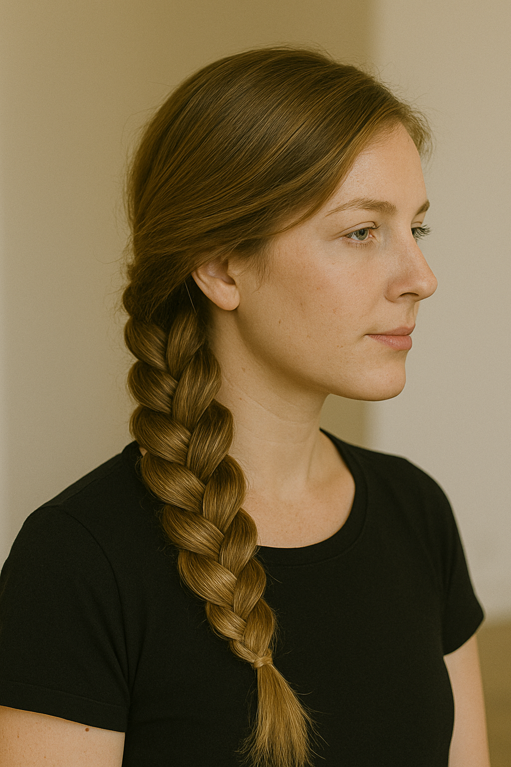 Sweep all your hair to one side and divide it into three equal sections. Braid down to the ends, keeping the tension loose rather than tight for a more relaxed vibe.