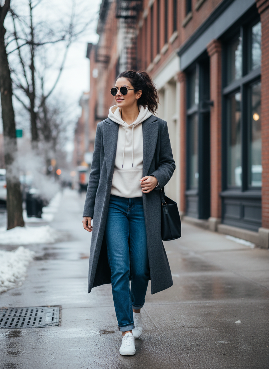 3. Structured Coat + Hoodie + Straight Jeans