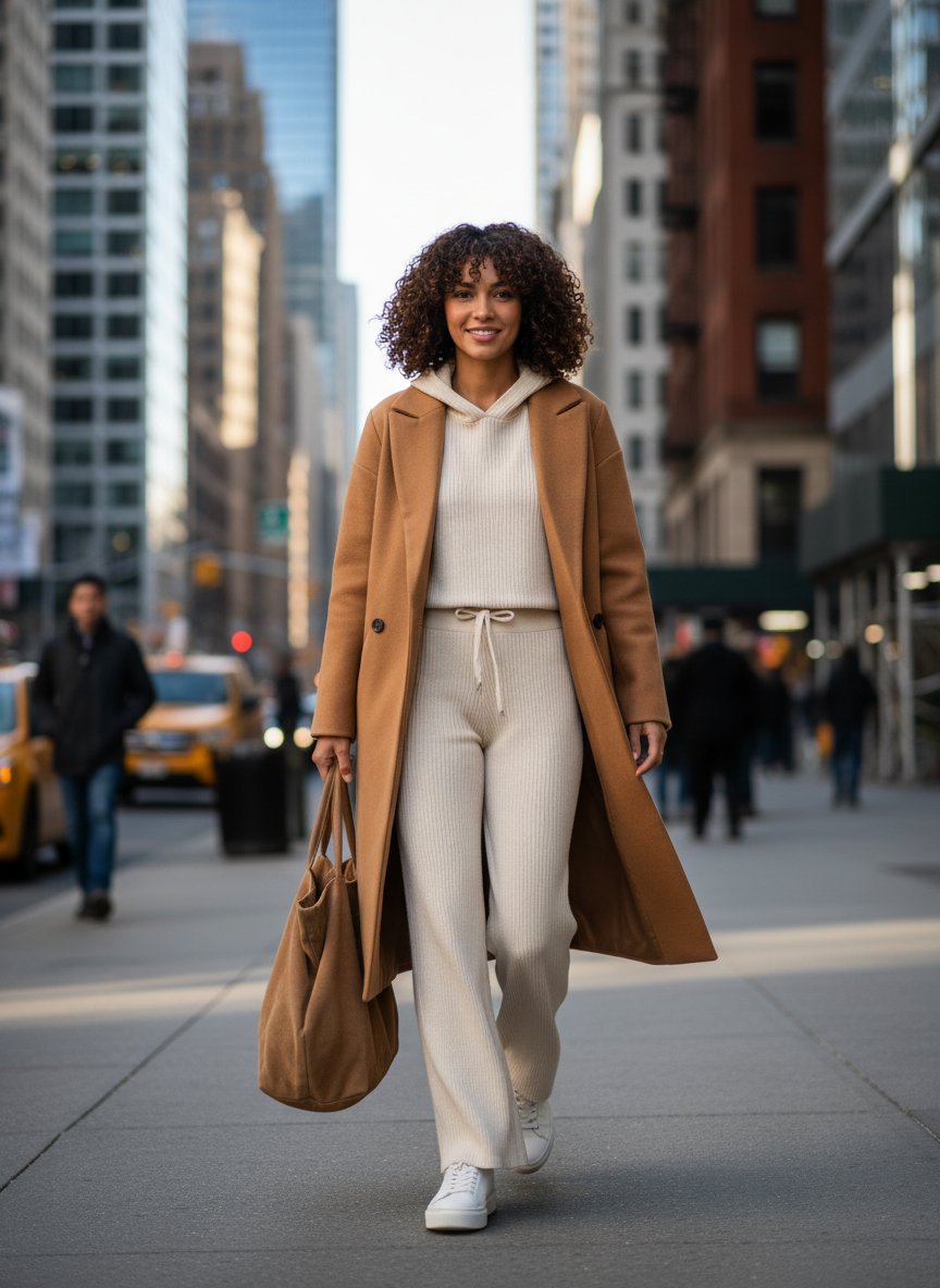 The magic happens when you add a structured overcoat—suddenly your cozy loungewear becomes an actual outfit.