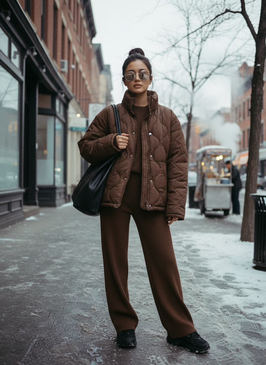 11. Puffer Jacket + Ribbed Set + Sporty Sneakers