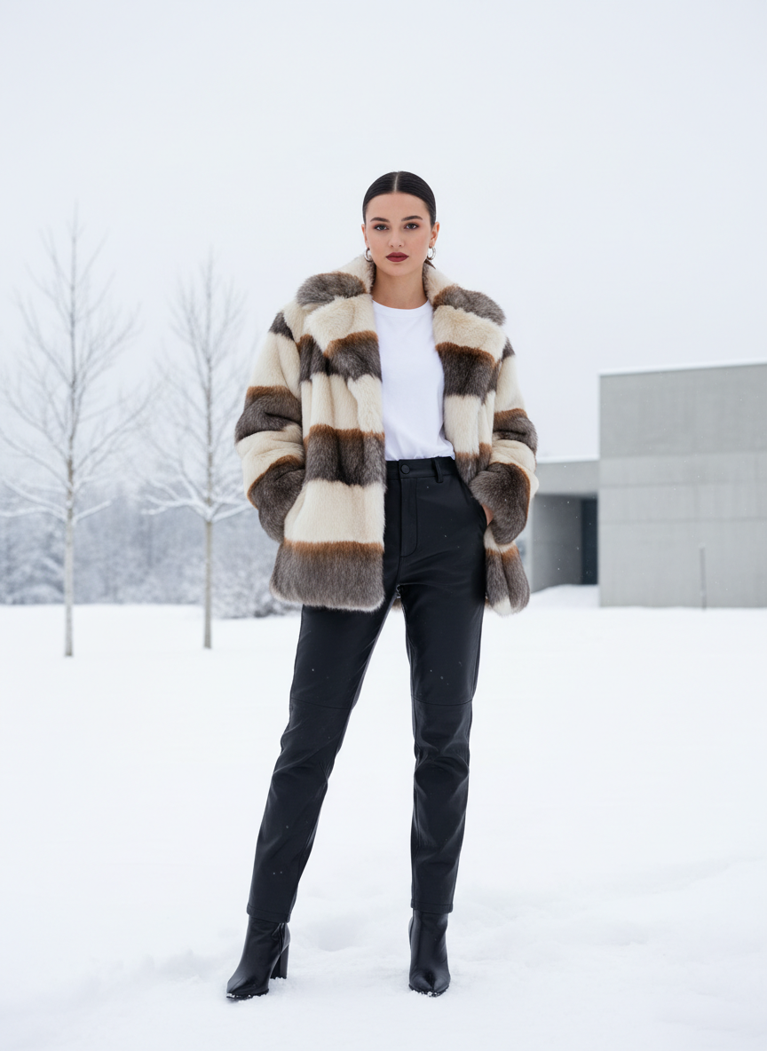 13. Faux Fur Coat + Simple Base (Tee + Trousers) + Sleek Boots
