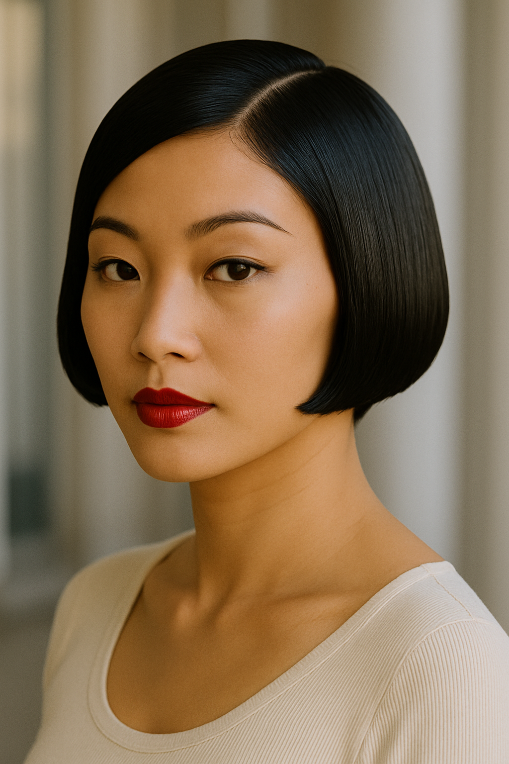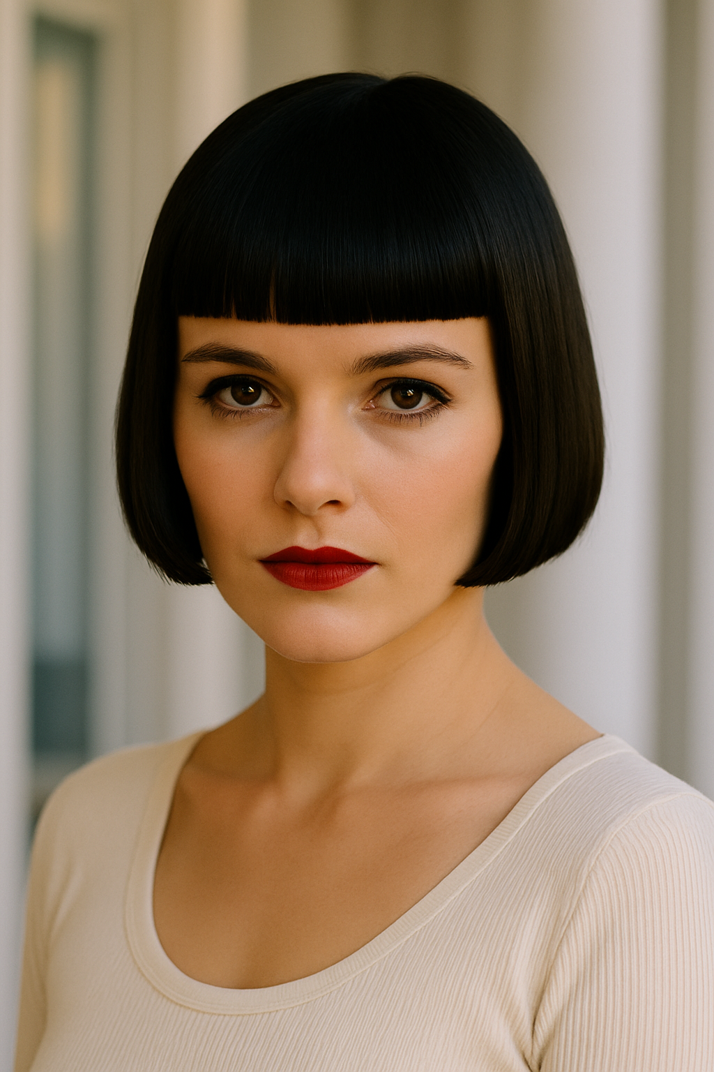 Her chin-length bob featured perfectly straight, blunt-cut edges that framed her face like a work of art.