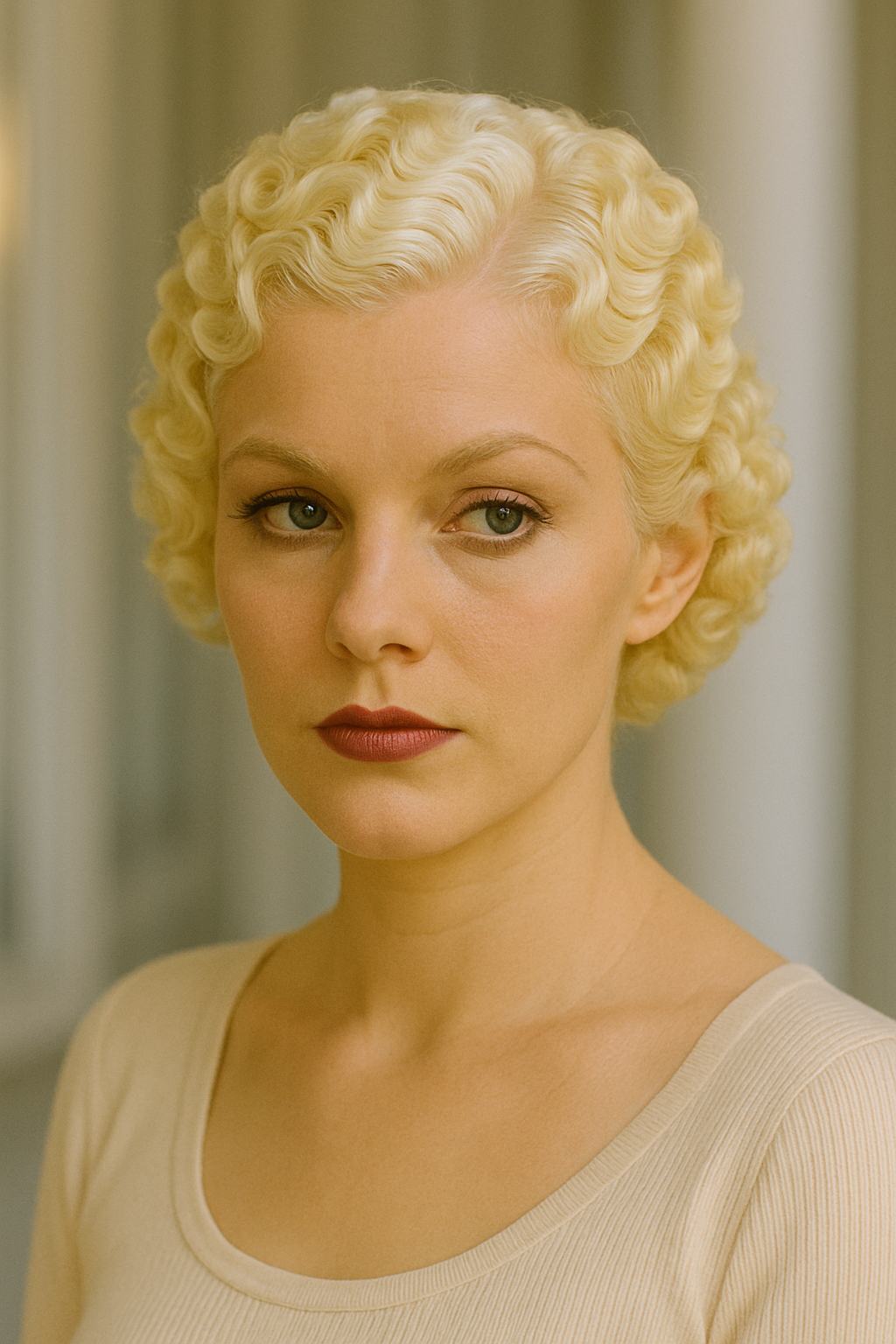 Jean Harlow turned heads everywhere with her shocking platinum blonde hair styled in tight, structured pin curls.