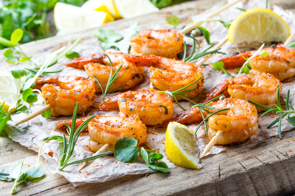 Grilling shrimp on skewers makes them easy to handle and fun to eat. Marinate your shrimp for fifteen to thirty minutes in olive oil, lemon juice, garlic, and your favorite herbs. Threading them onto skewers keeps them from falling through the grill grates and makes flipping super easy.