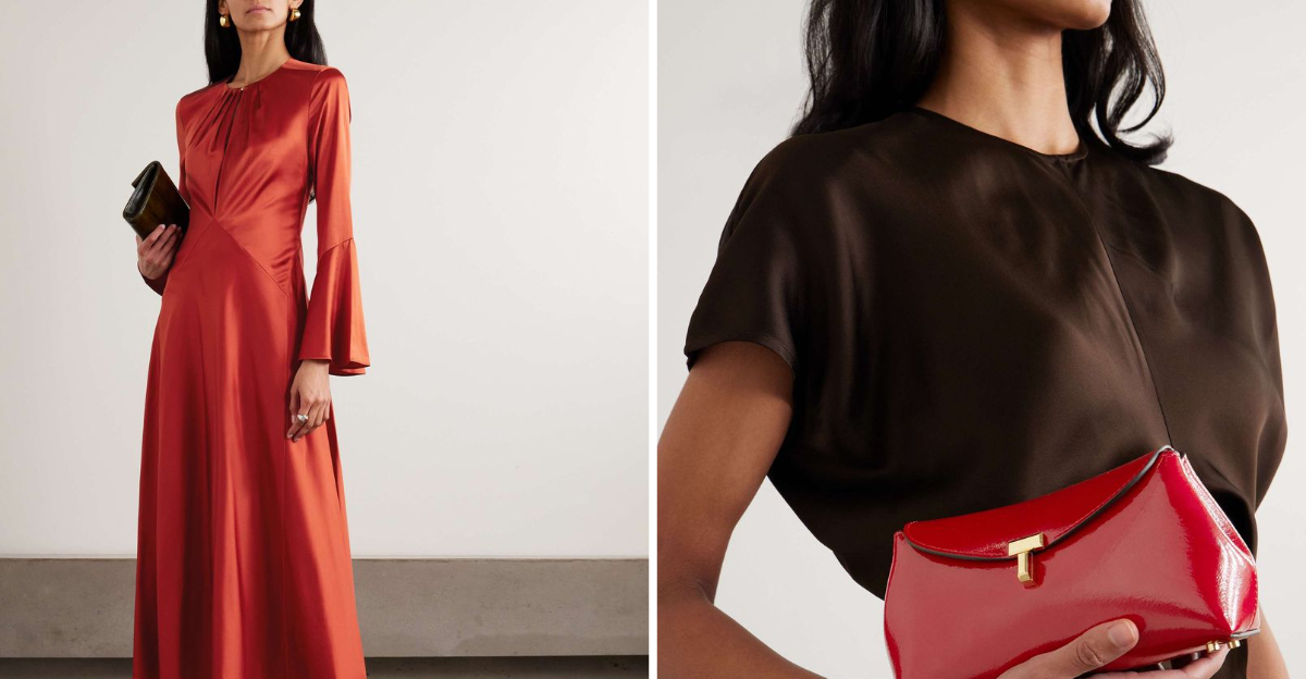 Choose a structured clutch in leather or velvet that can handle light moisture without damage.
