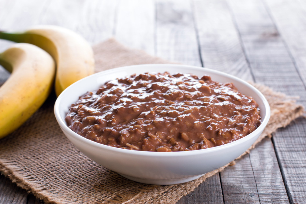 Mixing rolled oats with milk, protein powder, cocoa powder, and peanut butter creates a thick, pudding-like breakfast that tastes like brownie batter.