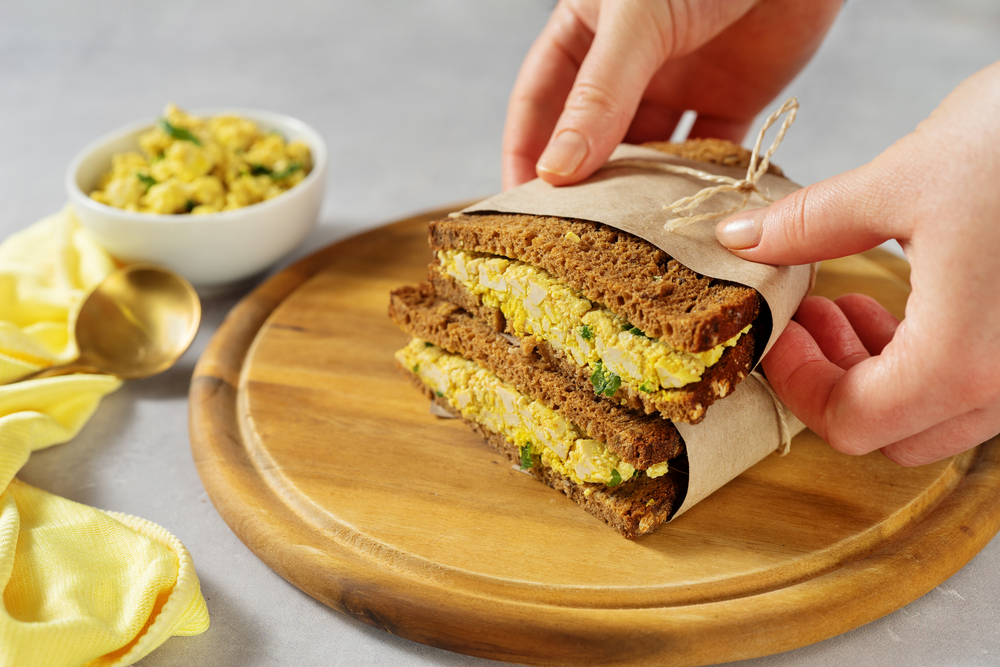Crumbling firm tofu and mixing it with vegan mayo, mustard, turmeric, and diced celery creates a surprisingly egg-like salad.