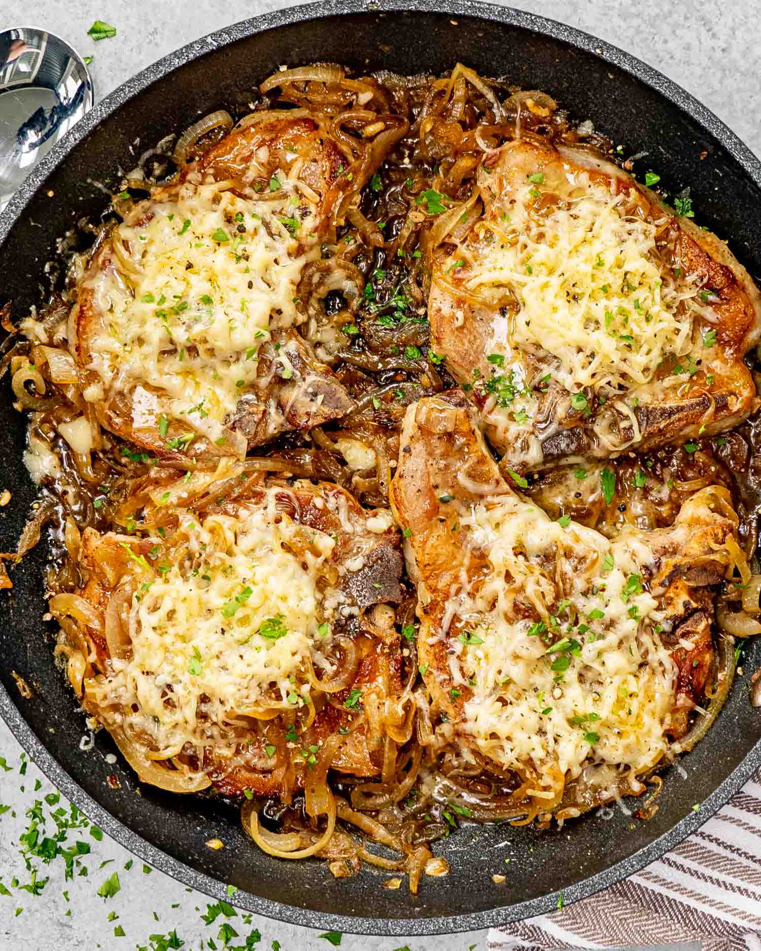 Imagine everything you love about a bowl of French onion soup, but piled on top of a juicy pork chop instead.