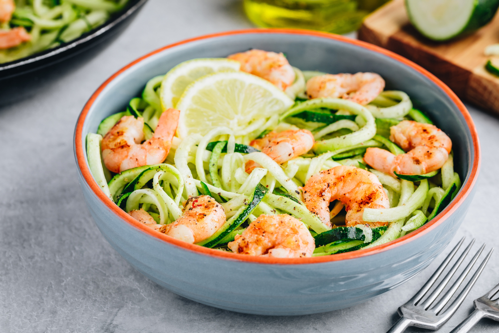 Swapping regular pasta for zoodles, which are spiralized zucchini noodles, keeps things light and adds an extra serving of vegetables to your meal.