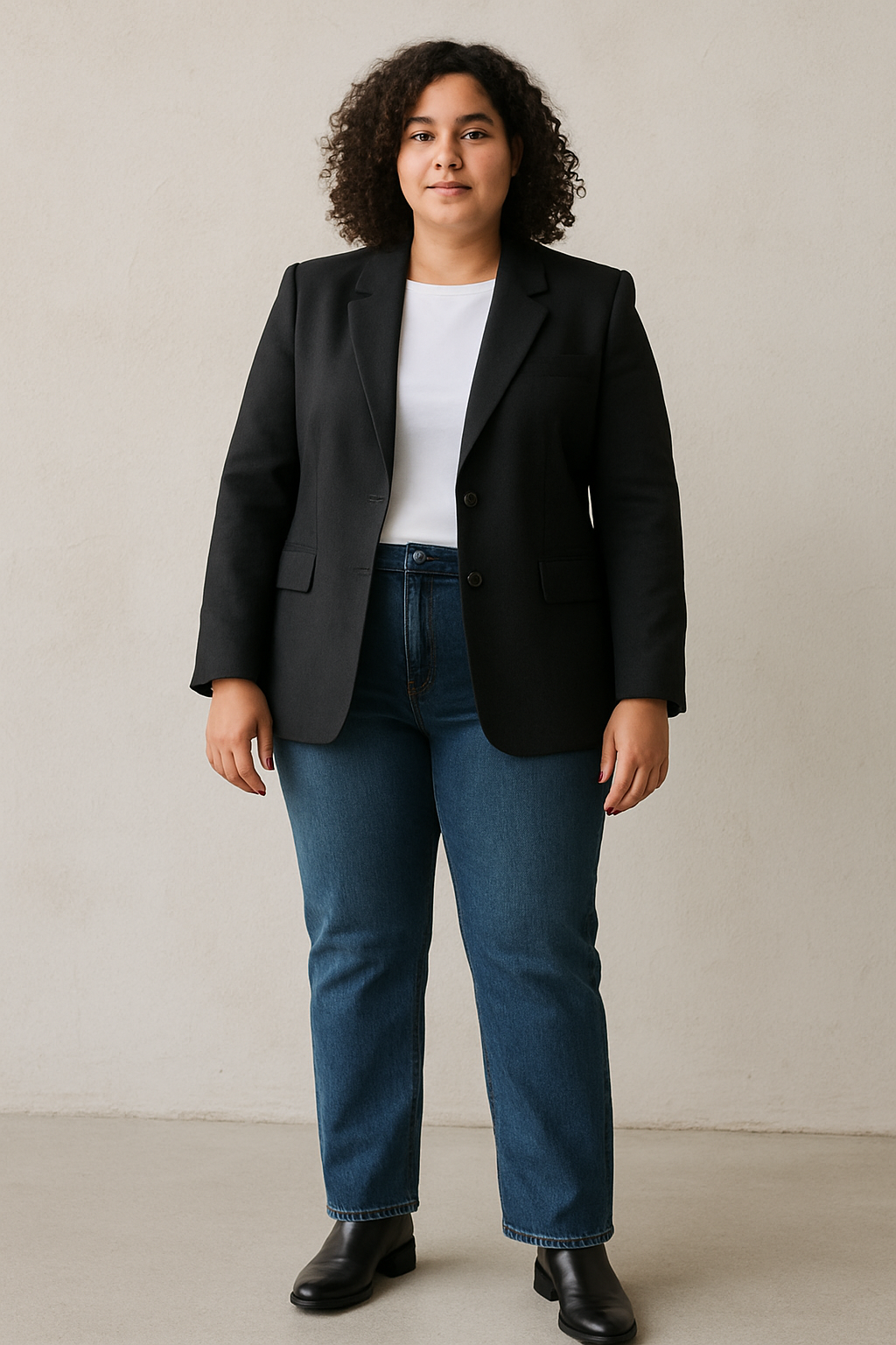 A tailored blazer paired with straight-leg jeans creates an effortlessly polished look that works for nearly any occasion. The structured shoulders and defined waist of the blazer add shape while maintaining comfort.