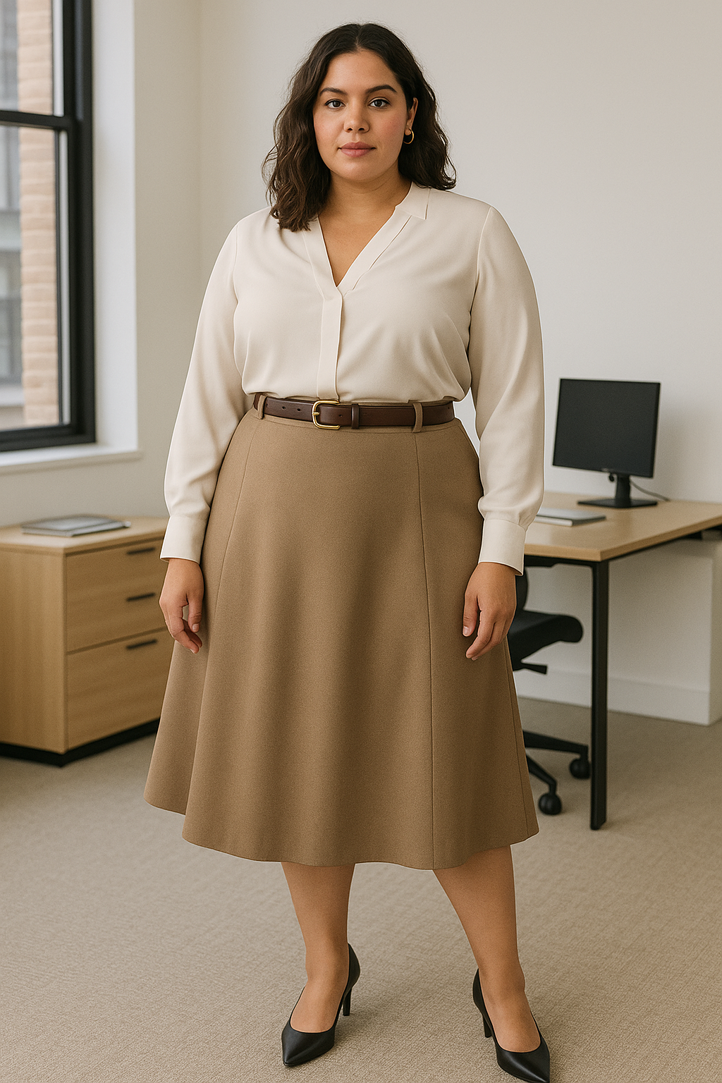 Choose skirts in structured fabrics that hold their shape throughout the day. Whether you opt for a classic solid or a playful pattern, this combination works beautifully for work, weekends, or special occasions with just a shoe swap.