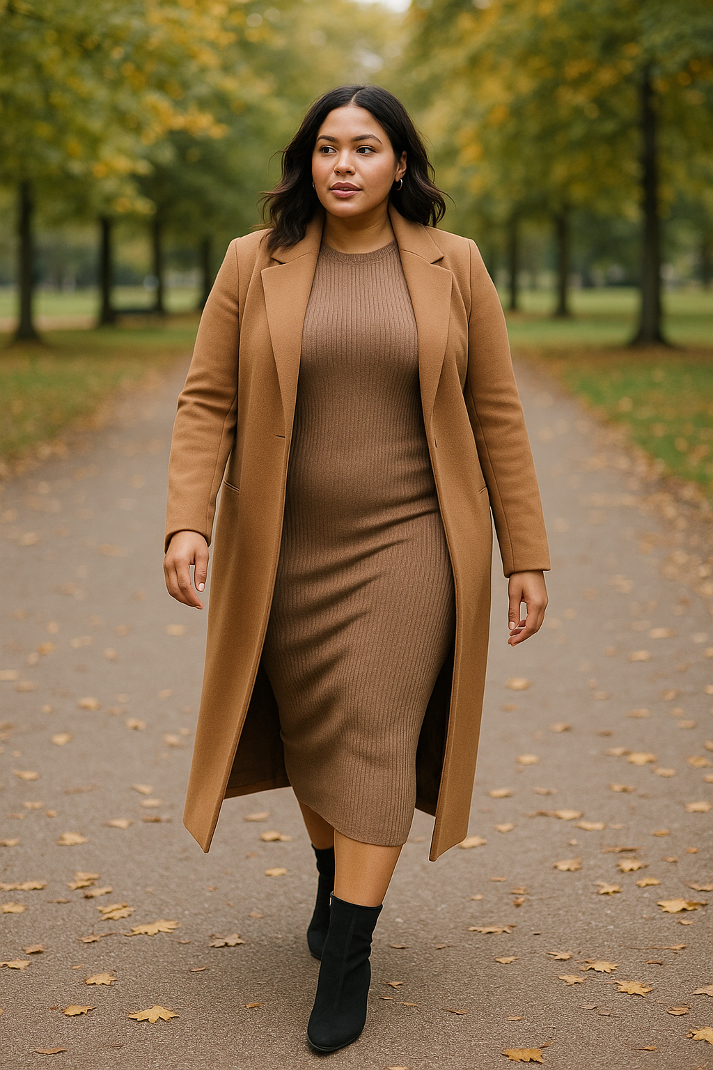 Layer a longline coat over top to add structure and sophistication to the look. The vertical line created by the coat elongates your silhouette beautifully, making you appear taller and more streamlined.