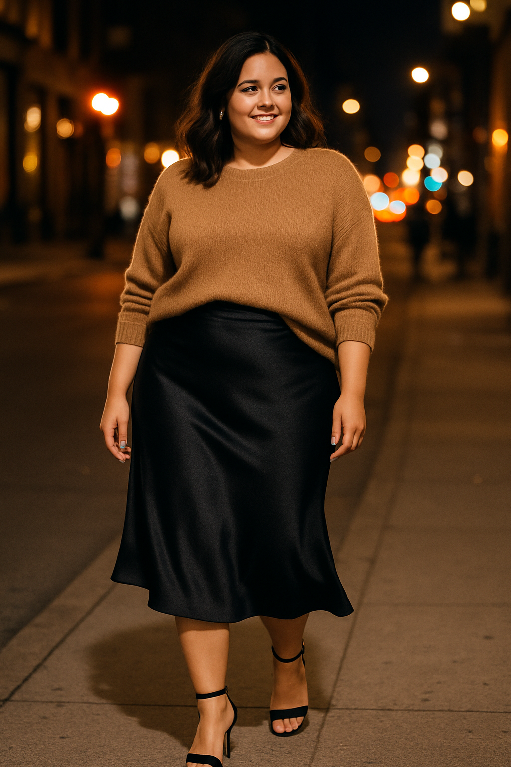 Tuck the sweater loosely into the skirt to define your waist while maintaining a relaxed, approachable feel. The slip skirt drapes beautifully over curves, creating elegant movement with every step.