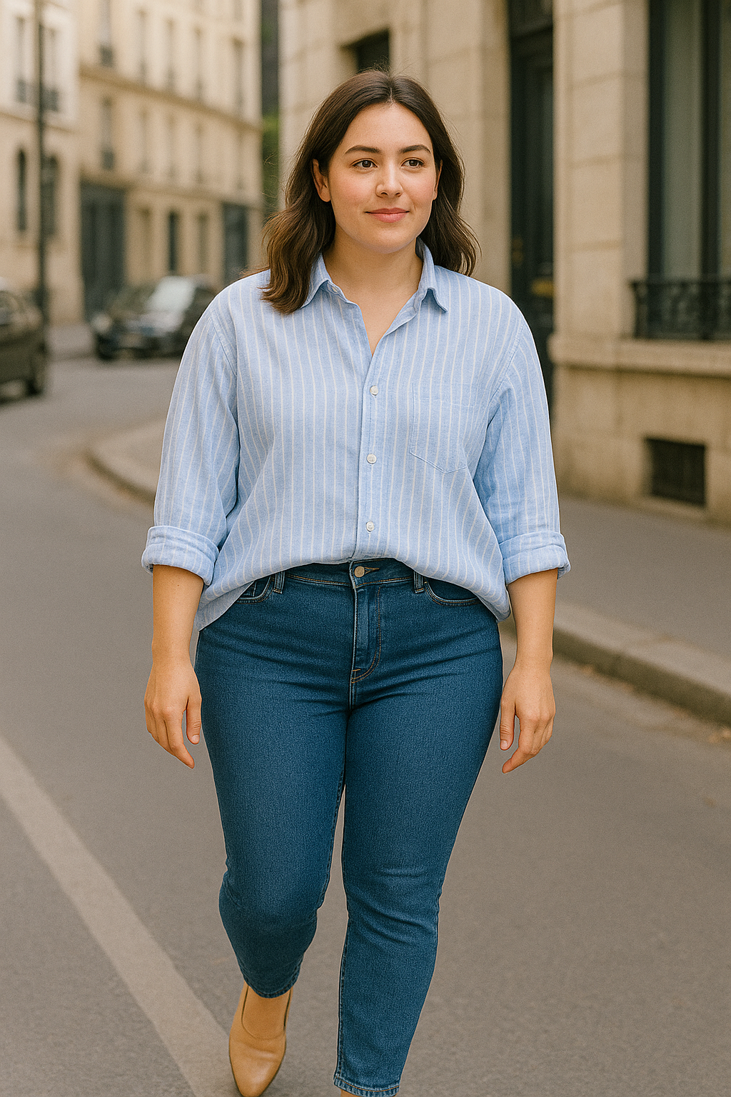 Balancing proportions is key to flattering midsize figures, and pairing slim jeans with an oversized button-up creates that perfect equilibrium. The fitted jeans show off your shape while the relaxed shirt adds effortless cool.