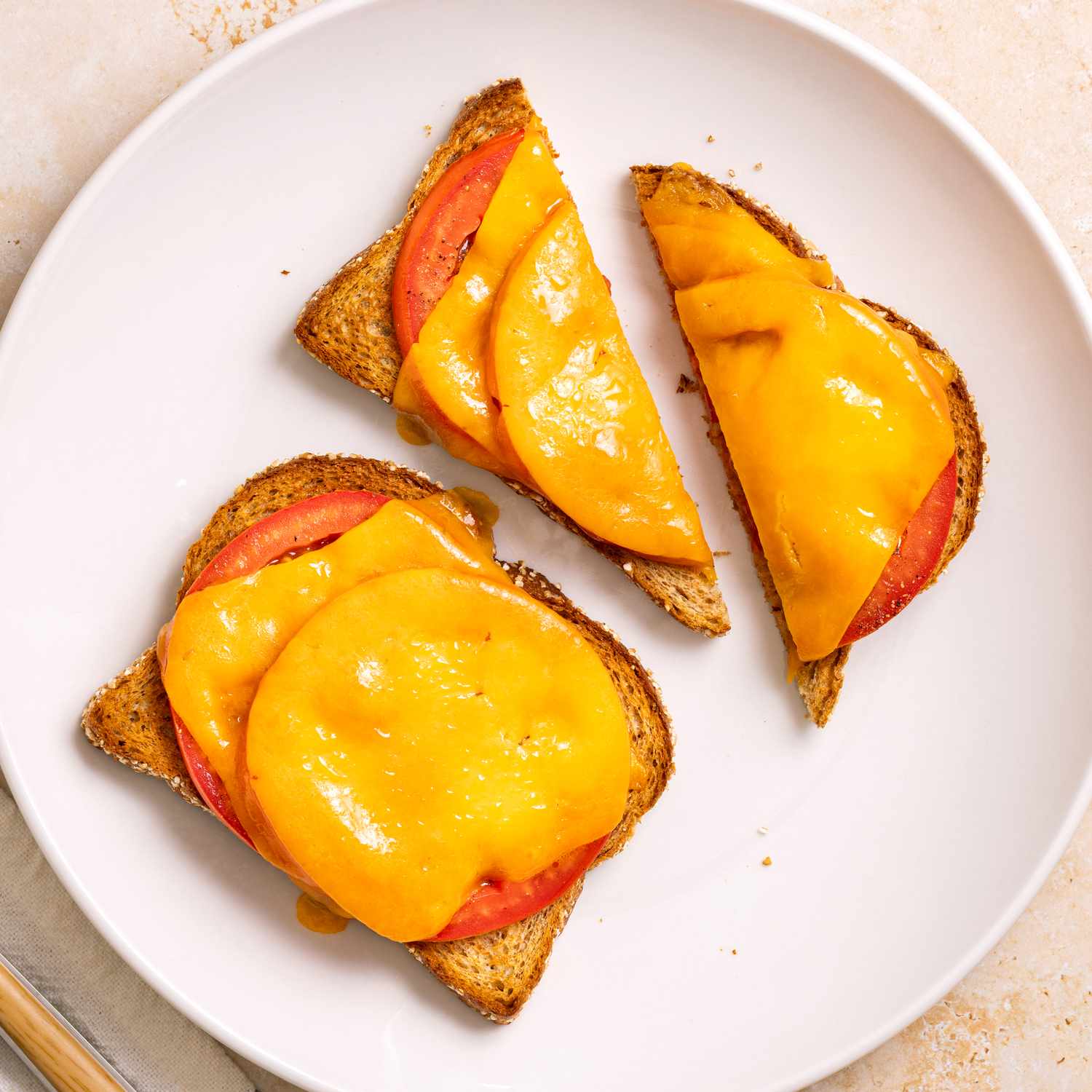 Grilled cheese gets a sophisticated upgrade with the addition of juicy tomato slices that add freshness and acidity.