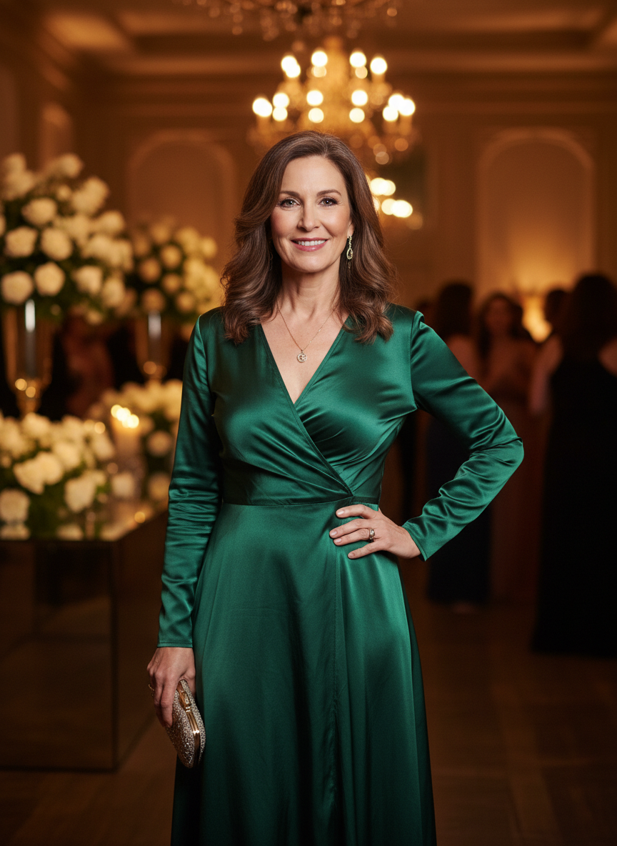 Rich colors like deep teal, midnight navy, or warm champagne gold are especially flattering under warm event lighting.