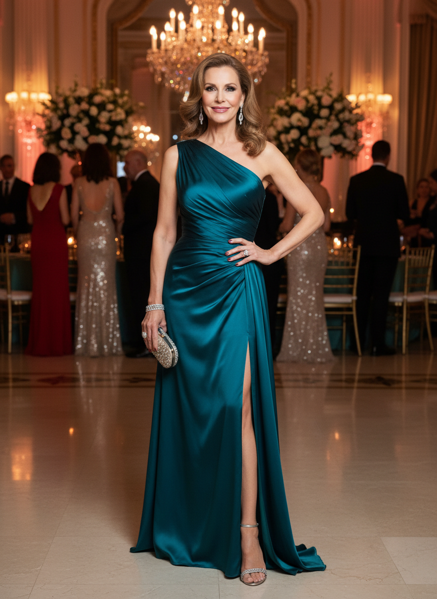 A satin one-shoulder evening dress delivers old-Hollywood glamour with a modern edge that feels fresh and exciting rather than overdone.