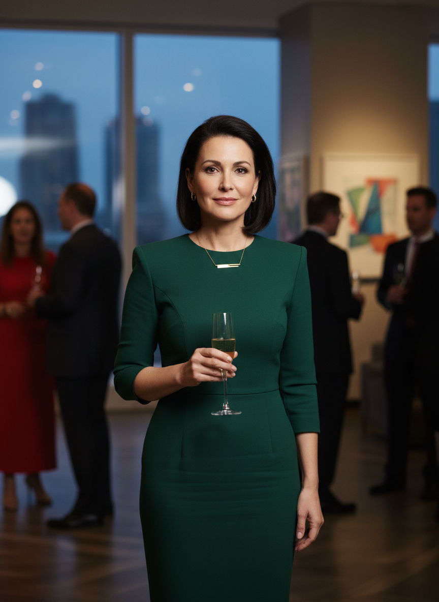 A structured sheath dress with subtle shoulder pads creates a strong, commanding silhouette that radiates confidence and authority.